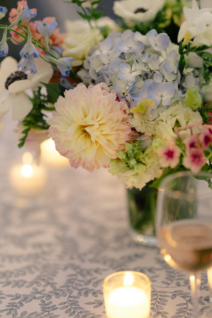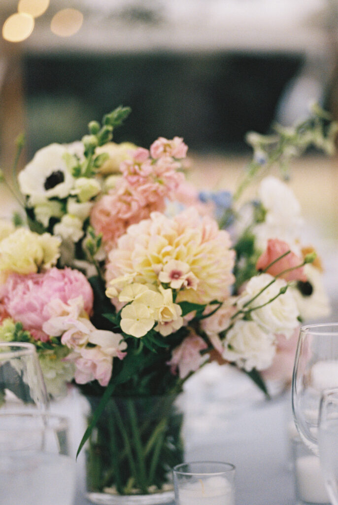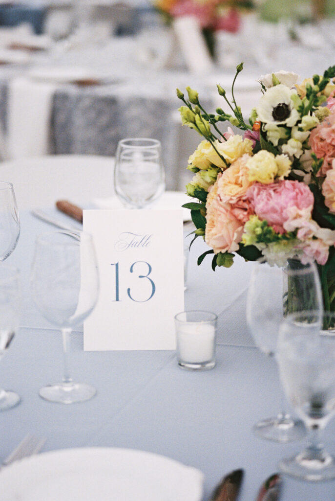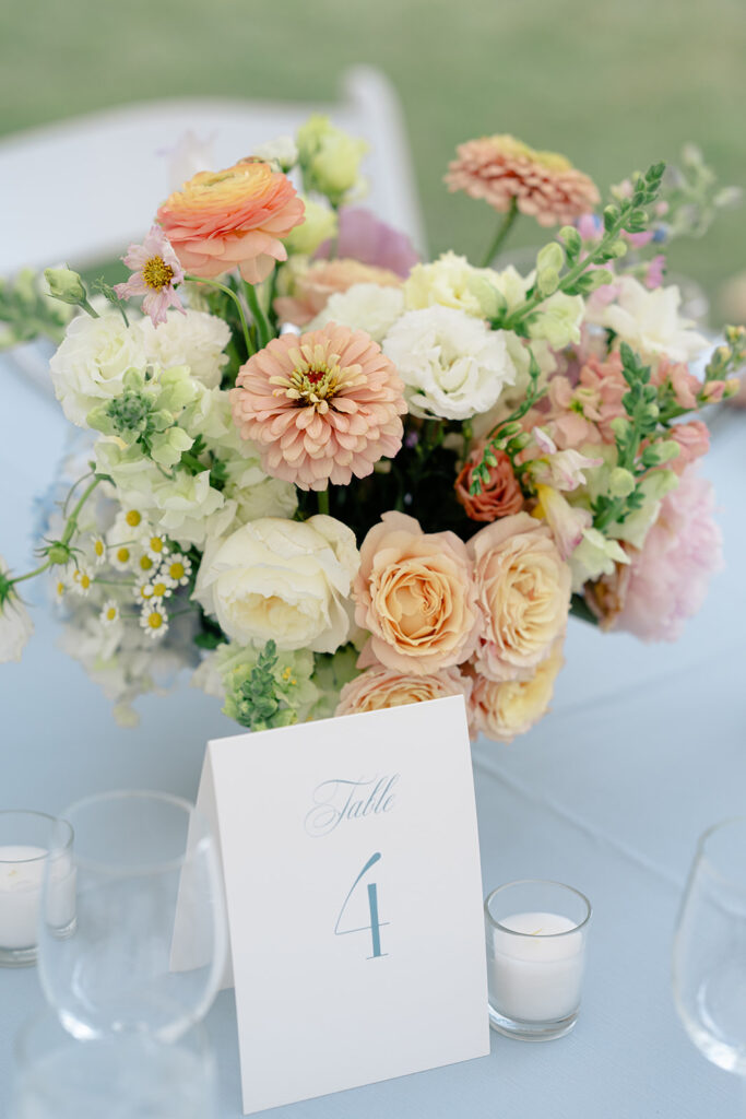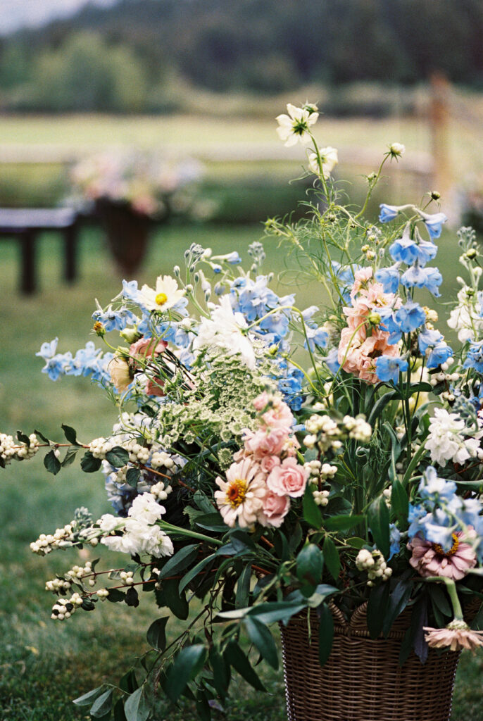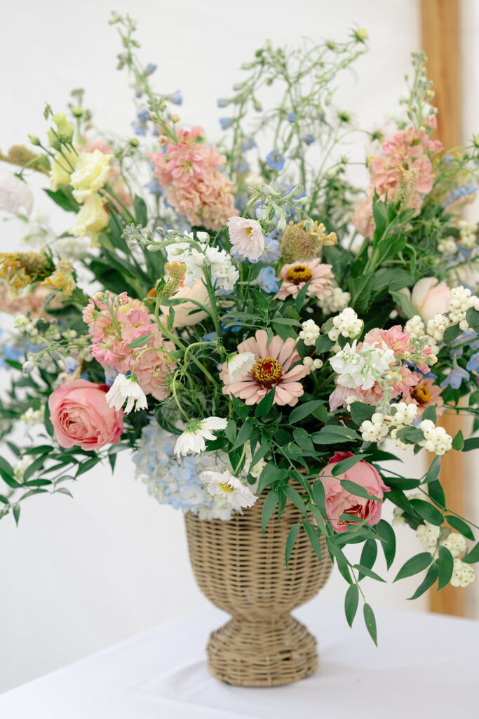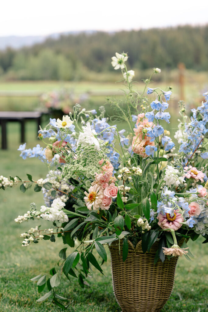 The couple choose an elegant but minimal design focusing more on blue and then pops of peach, yellow, and pink. Two different linens were used during reception with a single center pieces and candles. For the aisle, beautiful woven baskets held large florals that lined the aisle.