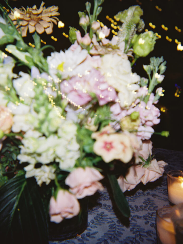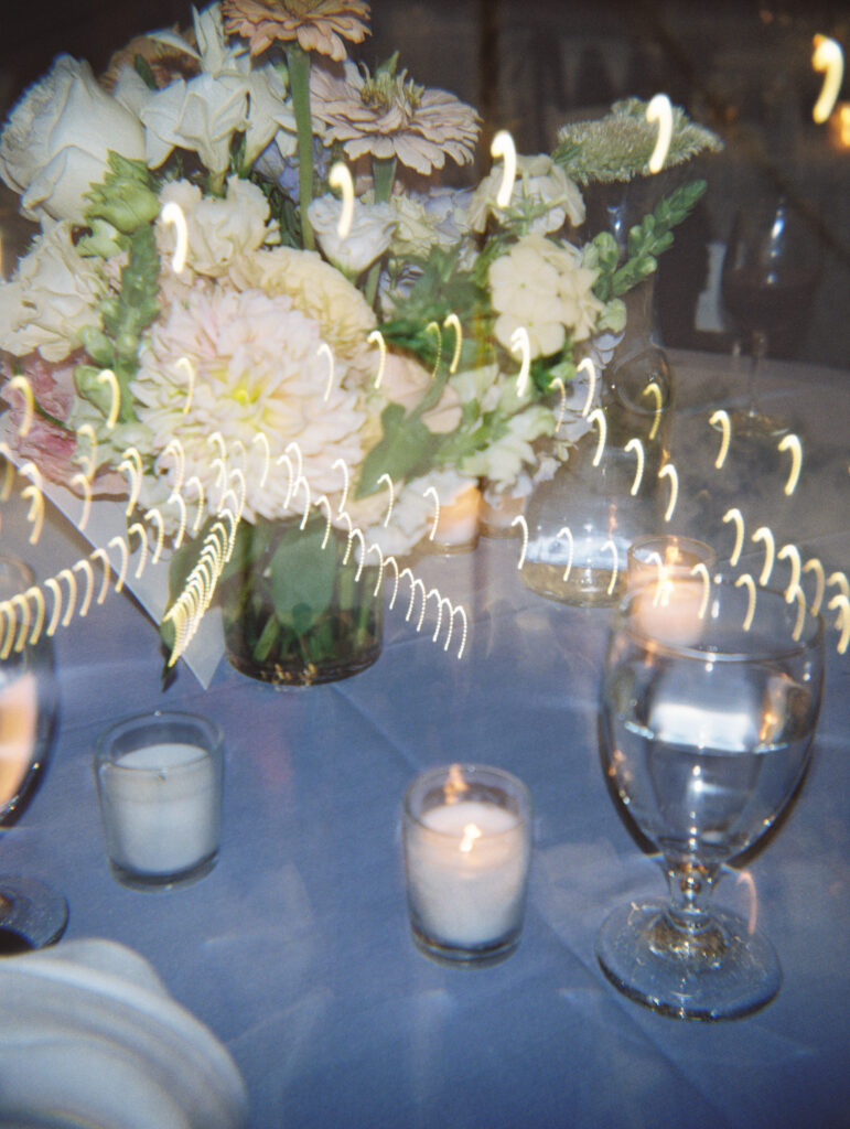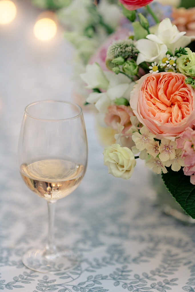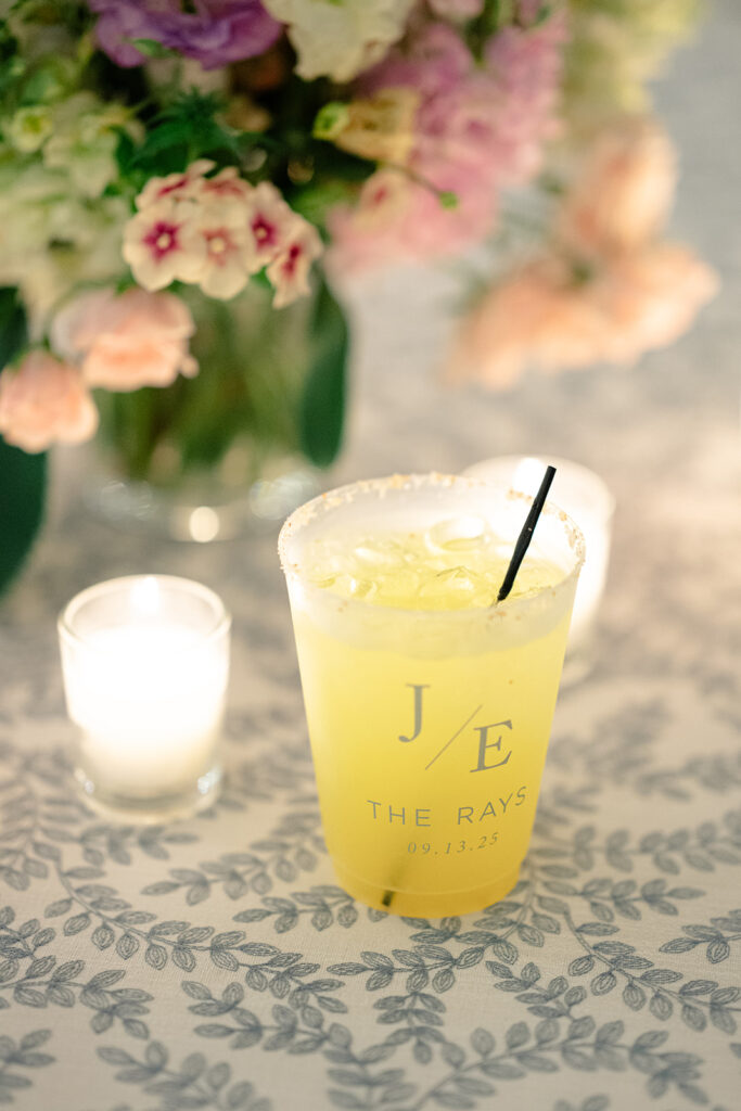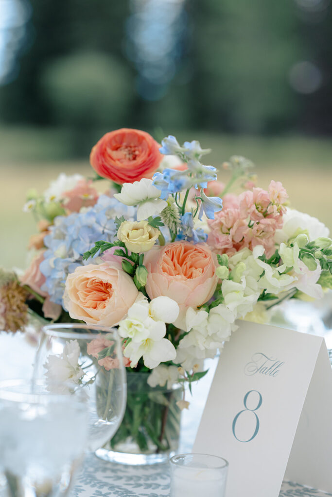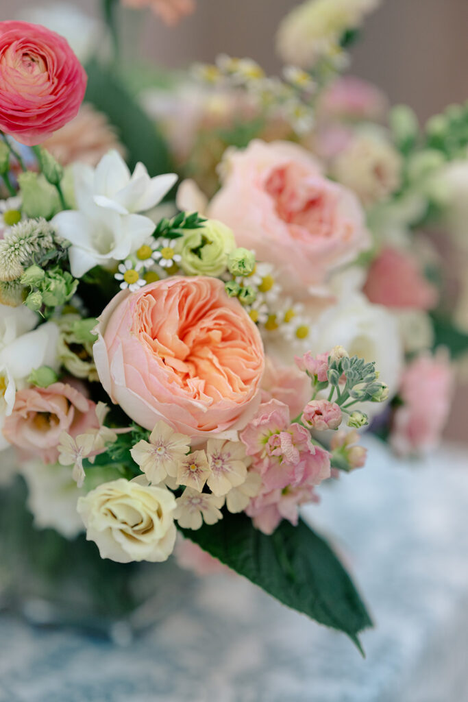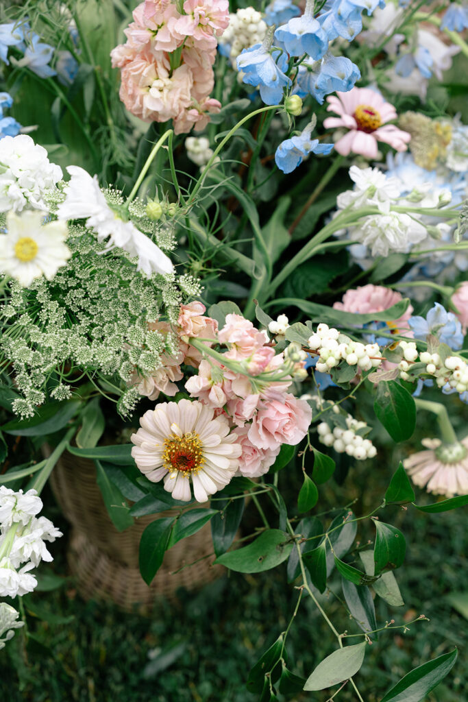 The couple choose an elegant but minimal design focusing more on blue and then pops of peach, yellow, and pink. Two different linens were used during reception with a single center pieces and candles. For the aisle, beautiful woven baskets held large florals that lined the aisle.
