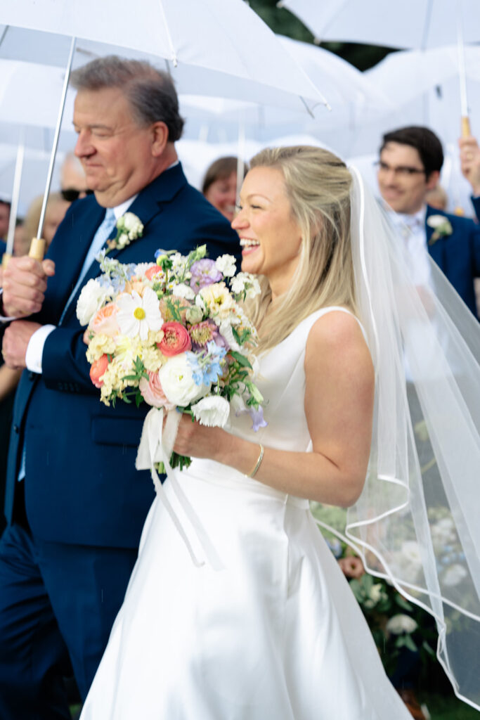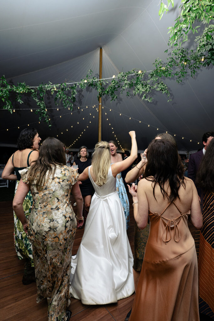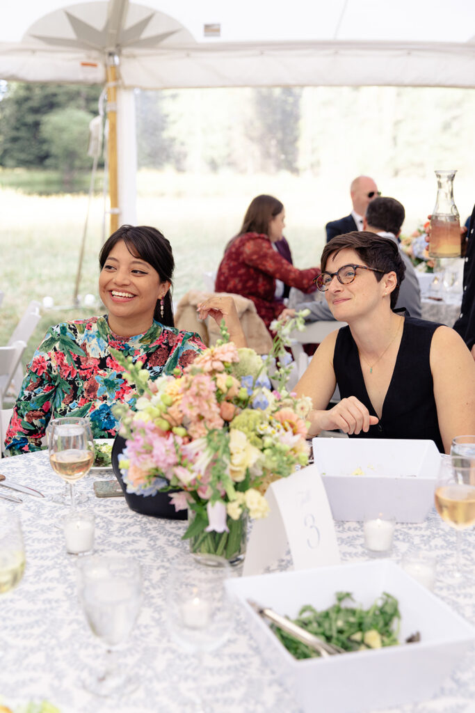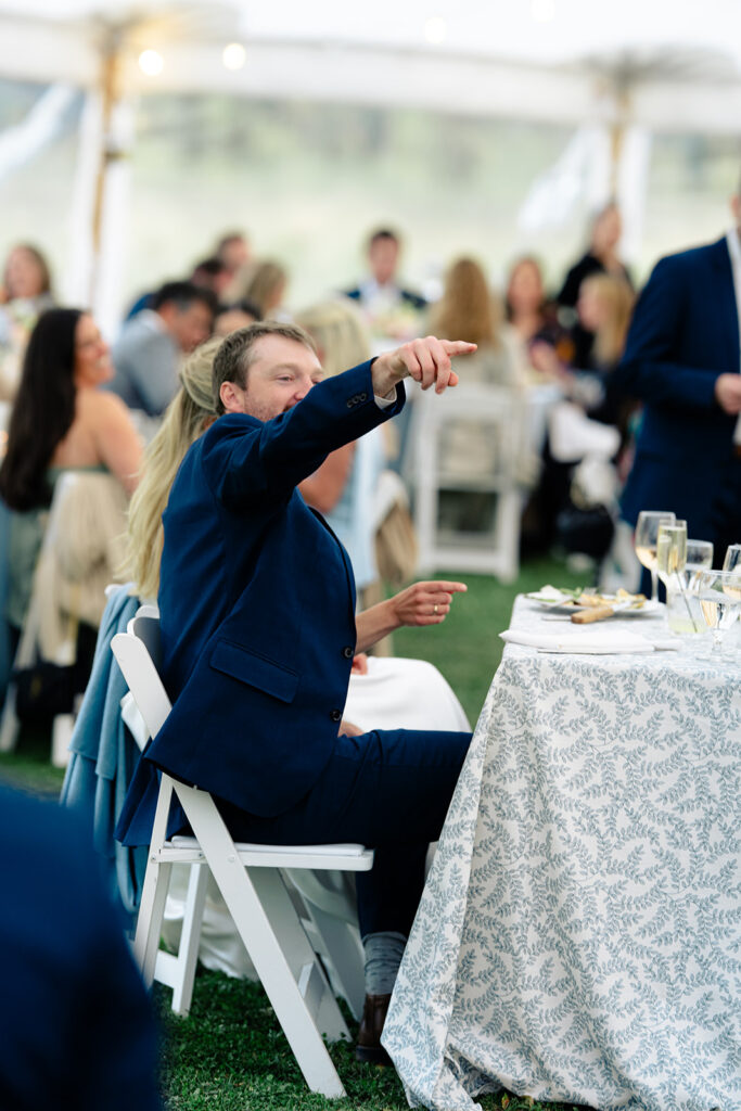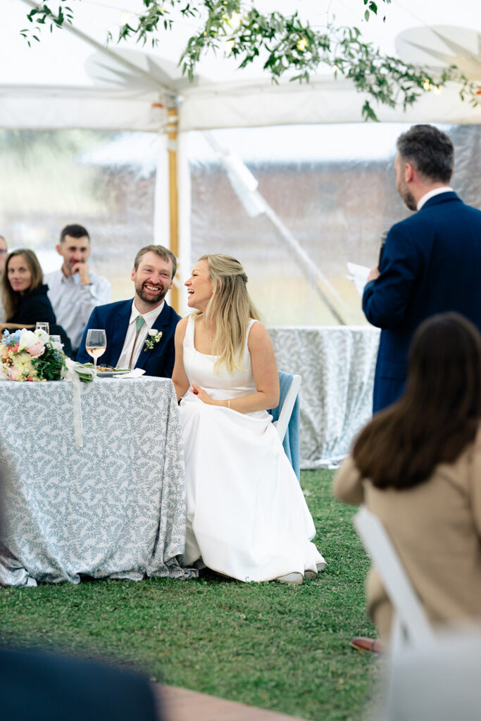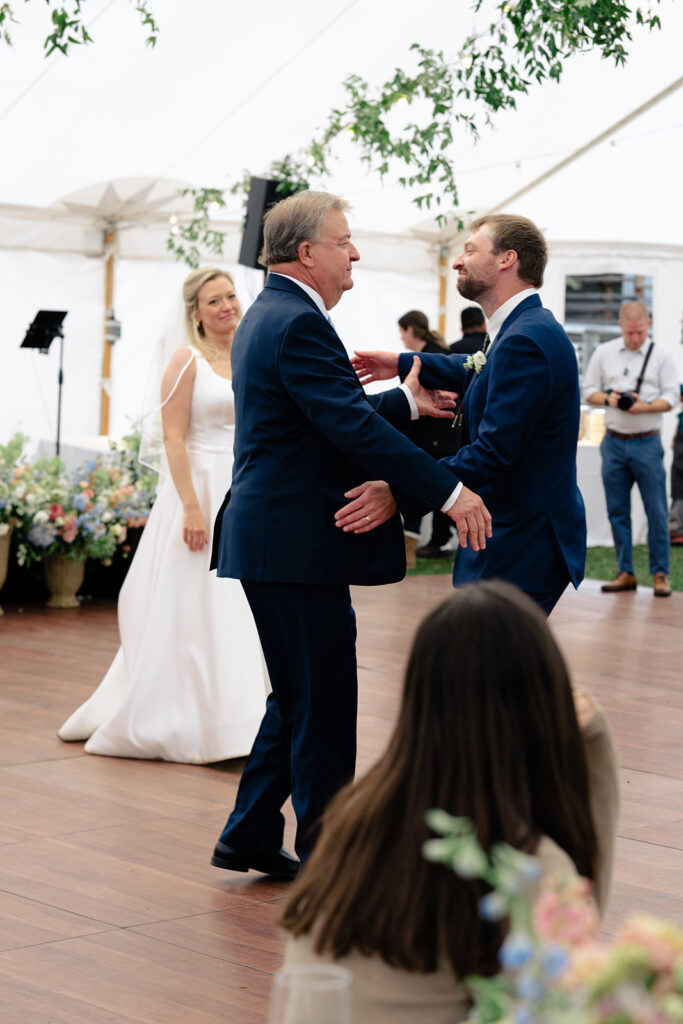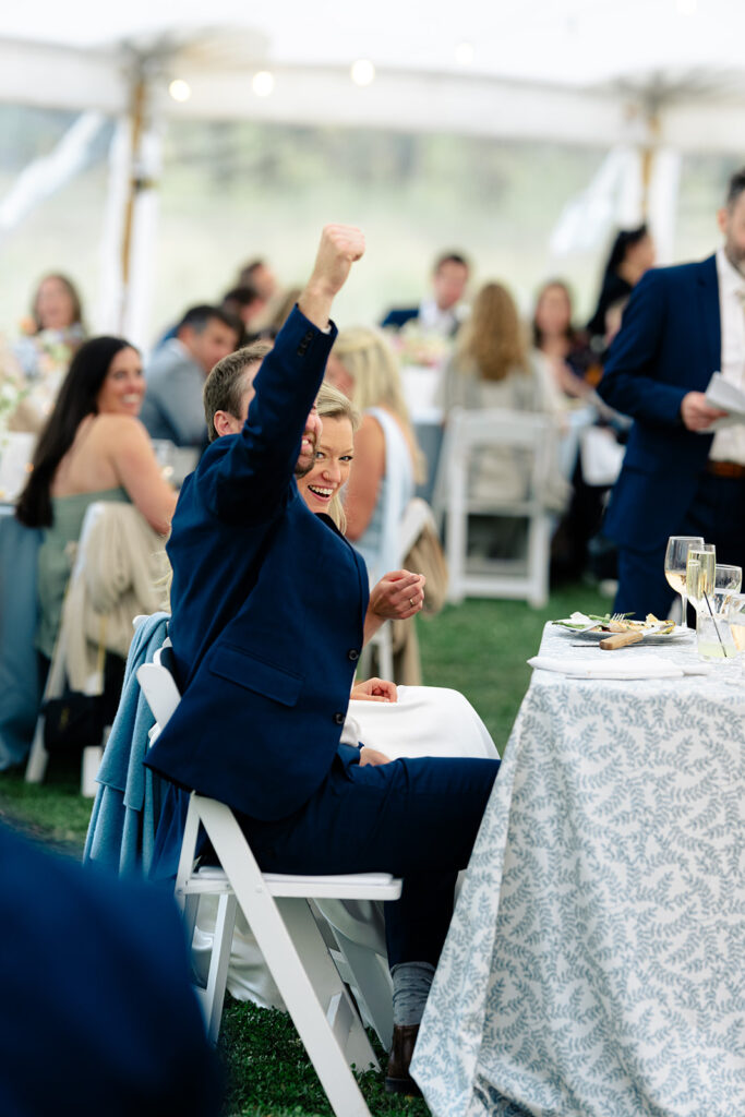 Because the rain was stil drizzling after the ceremony, guests were directed to the reception tent rather than the barnside cocktail hour. It turned out perfect though because the sun came out and guests were able to enjoy the field and watch the horses being lead out to pasture!